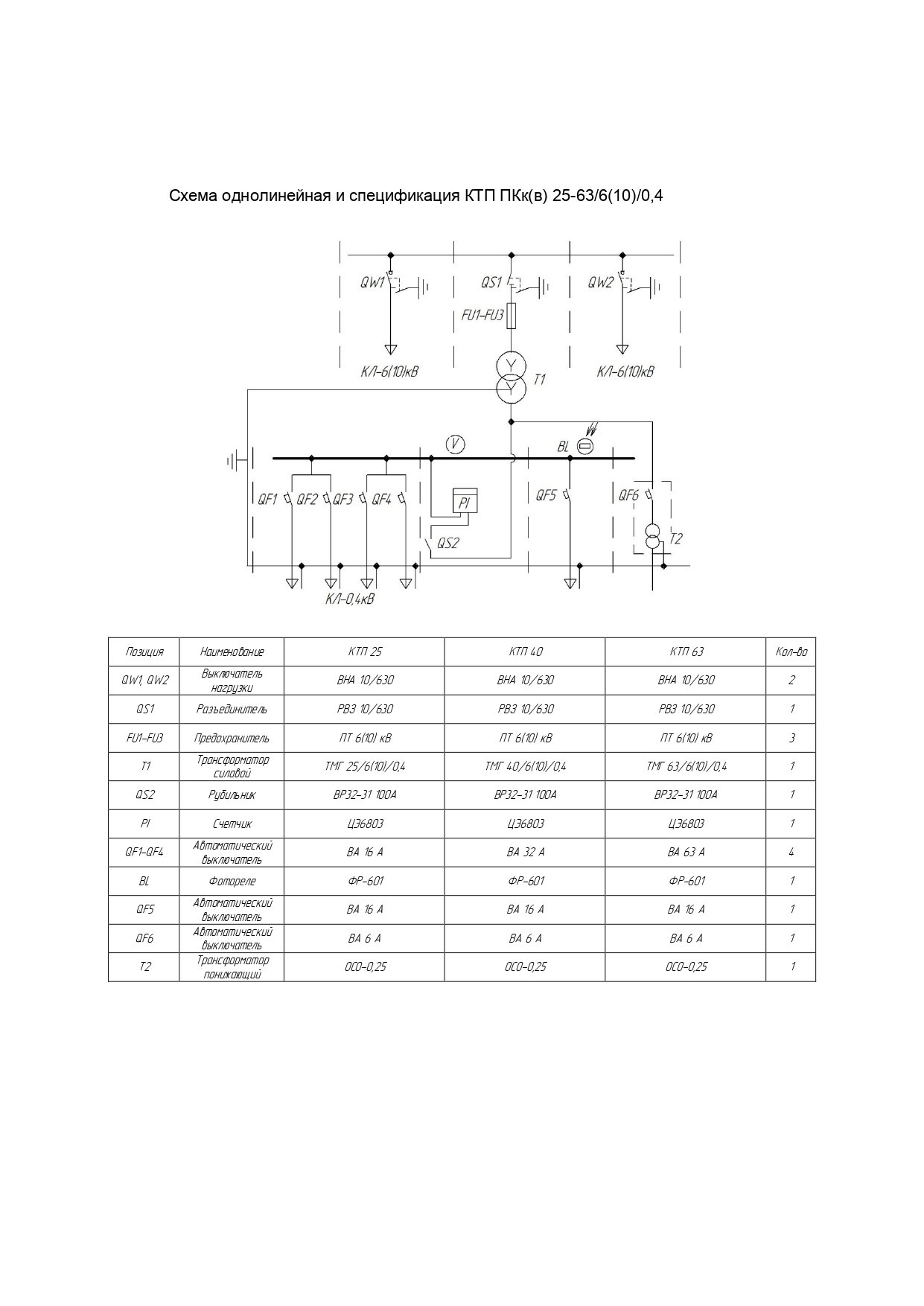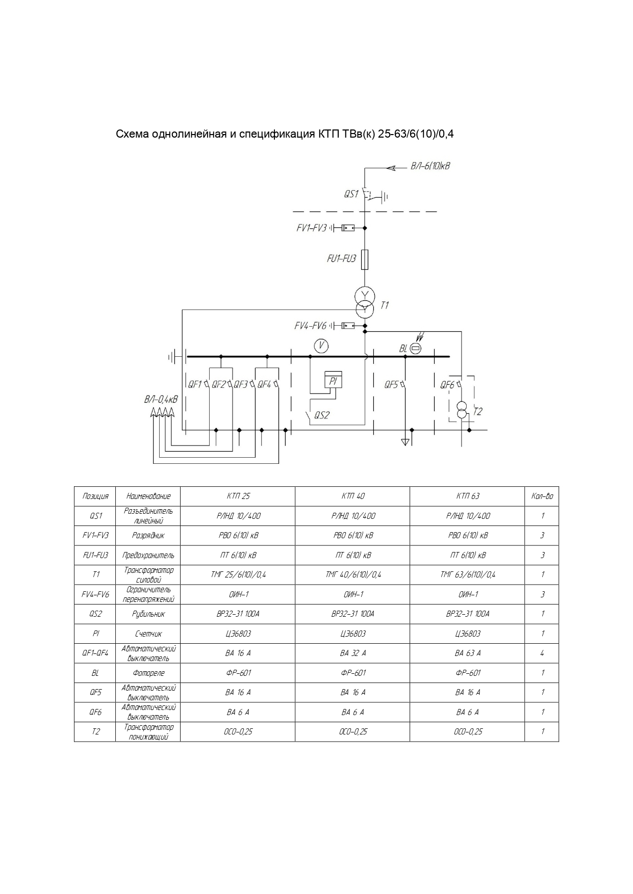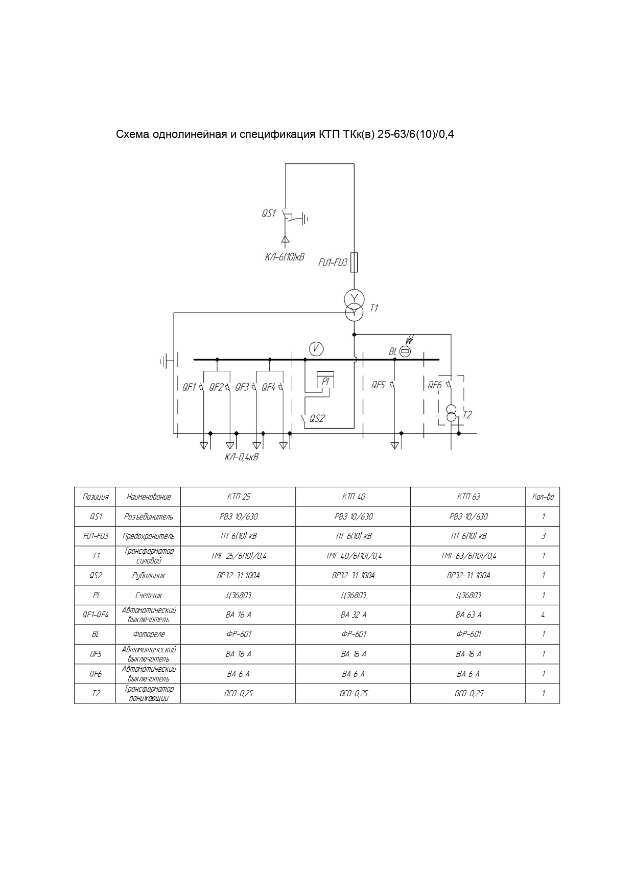 Подстанции выполняются по тупиковой или проходной схеме с воздушным и/или кабельным исполнением вводов ВН и НН (высокого и низкого напряжения). При воздушном вводе КТП подключается к ЛЭП через устанавливаемые на опоре высоковольтные разъединители, которые могут поставляться вместе с КТП в зависимости от требований заказчика.