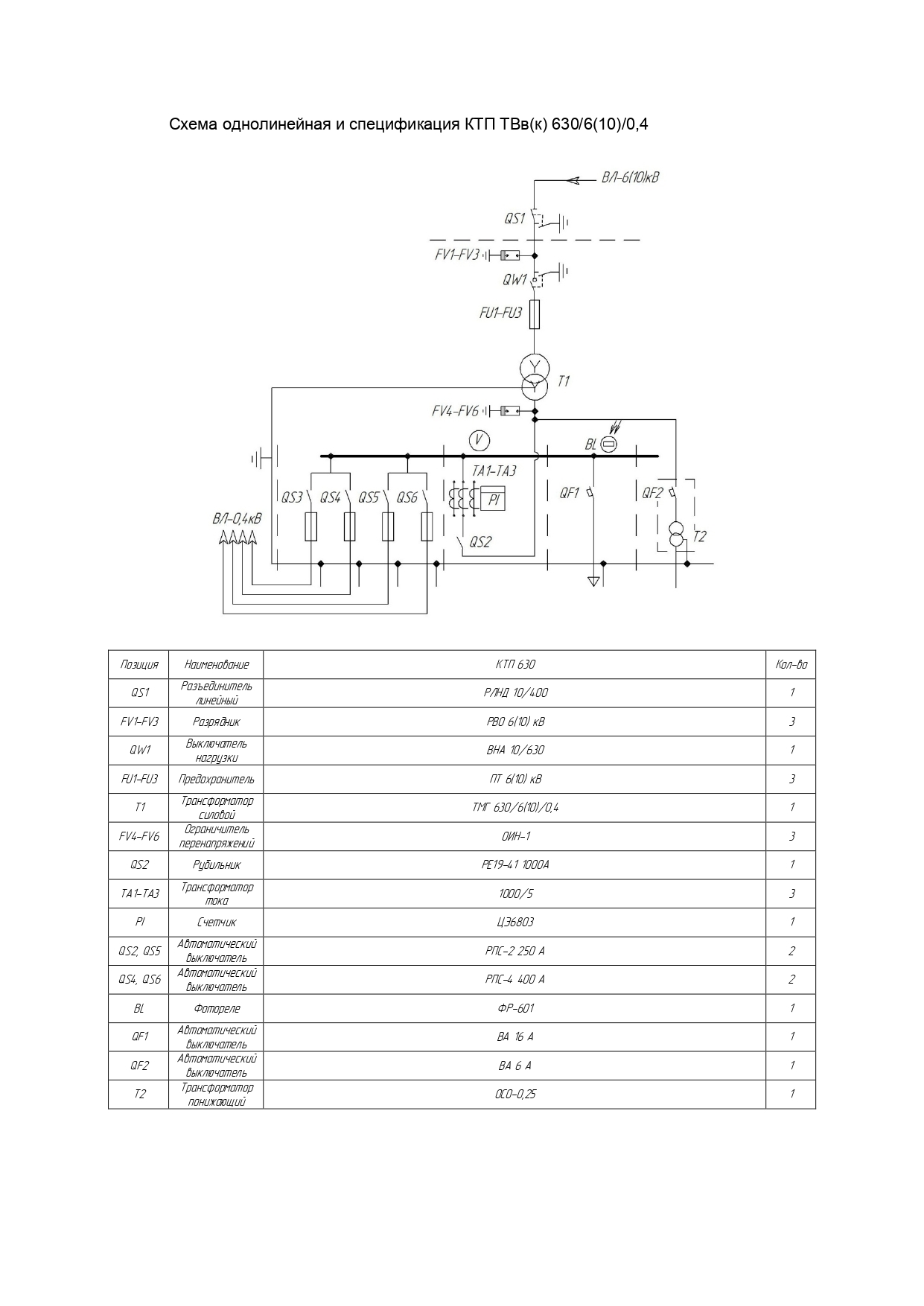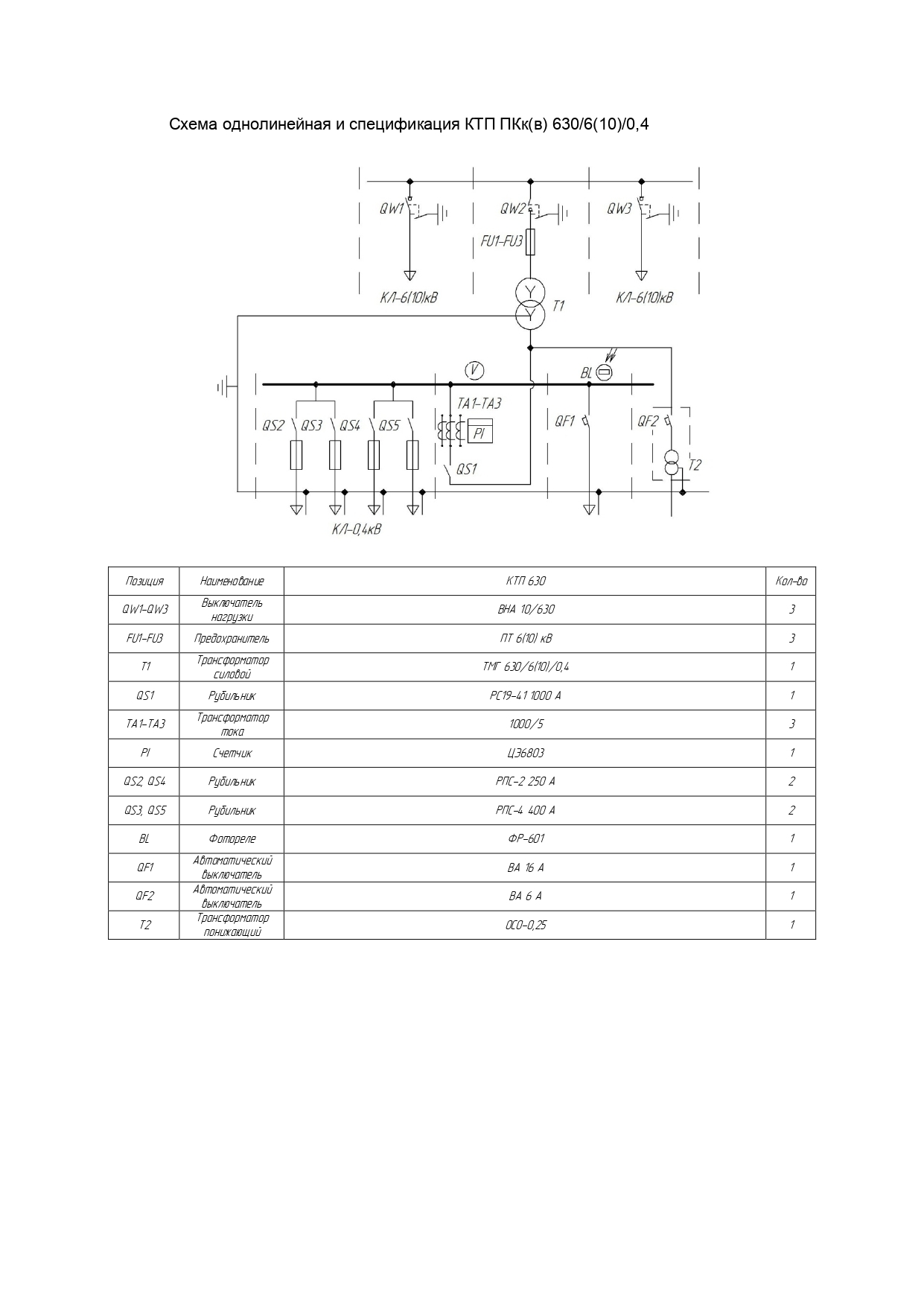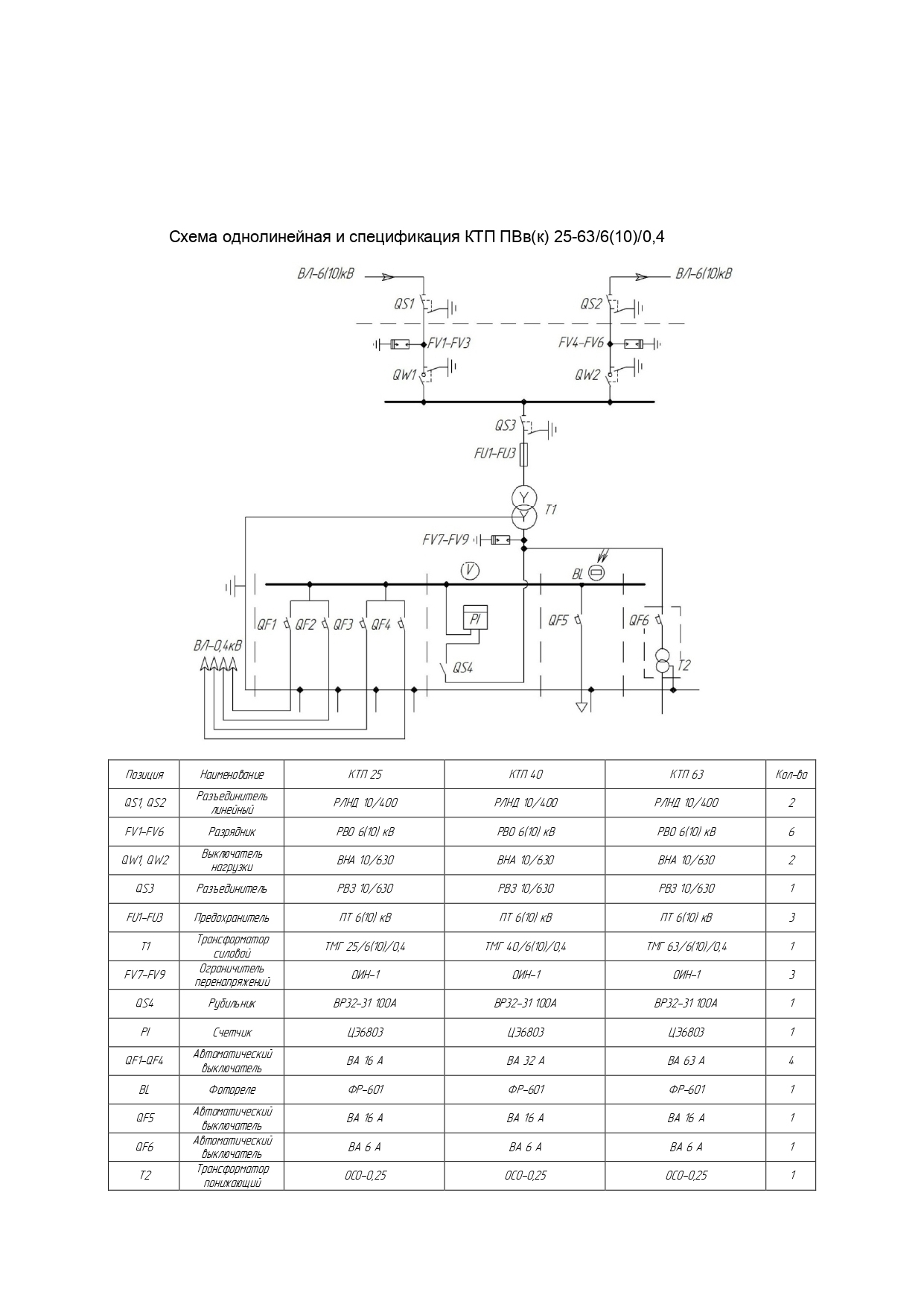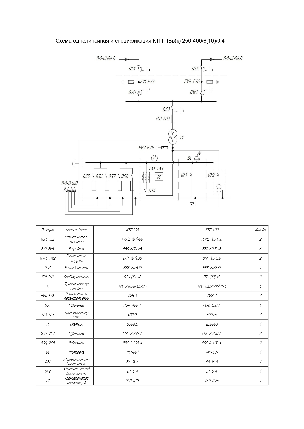 Подстанции выполняются по тупиковой или проходной схеме с воздушным и/или кабельным исполнением вводов ВН и НН (высокого и низкого напряжения). При воздушном вводе КТП подключается к ЛЭП через устанавливаемые на опоре высоковольтные разъединители, которые могут поставляться вместе с КТП в зависимости от требований заказчика.